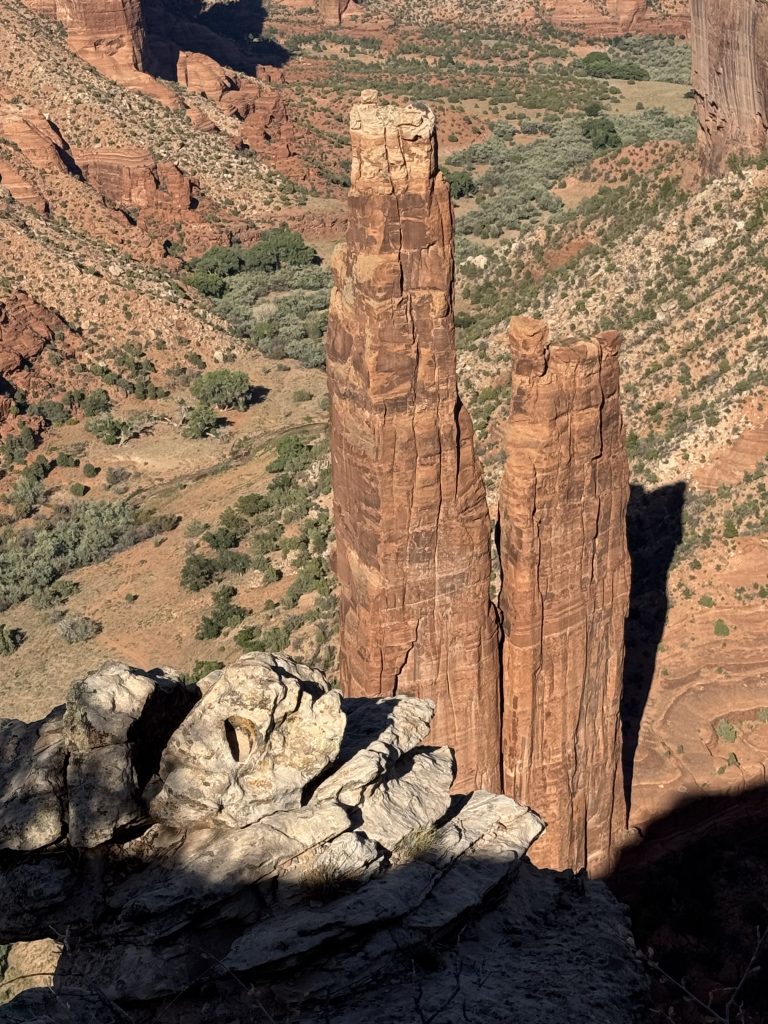 We drove the South Rim Drive and walked a short path to overlooks of the canyon floor and of the monolithic pinnacle Spider Rock.